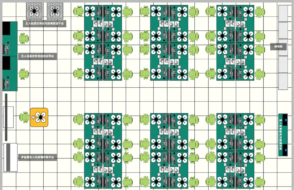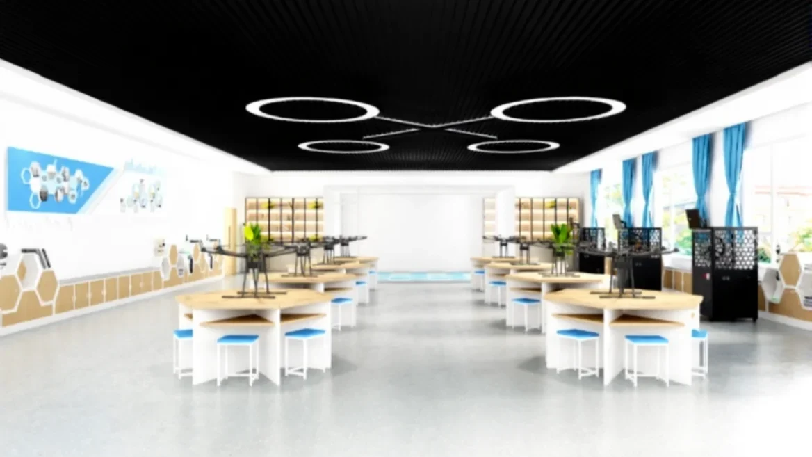 方案规划建设配套齐全的现代化实训室,配备仿真教学、组装调试、飞行训练及行业应用等先进设施设备。该实训环境不仅能支撑“理论-模拟-仿真-实操”一体化教学,更能满足组装、调试、维修、检测、行业应用及创新设计等全流程实训需求。同时,实训室兼具专业教学成果展示功能,可基本覆盖无人机应用技术专业教学的各个环节。