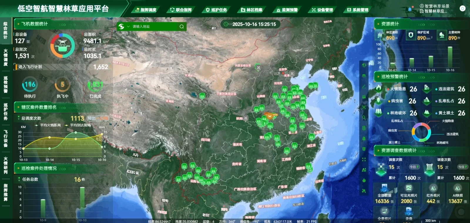 1. 无人机监测指挥调度:通过接入多架次无人机,实现行政区划分级管理,动态展示巡护范围、禁飞区域及飞行数据统计,结合搭载的高清摄像头、红外传感器及多光谱设备,构建全天候立体监测网络,精准识别病虫害扩散、非法砍伐迹象、早期火情热点等异常现象,同步生成坐标定位与可视化报告,为精准决策提供数据支撑。