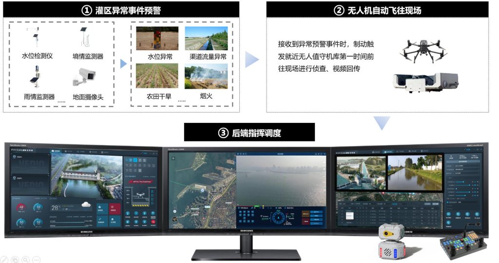 依托于低空AI算法能力,通过无人值守机场常态化巡检,可实时识别灌区管理异常事件,联动预警消息上报处置并智能生成巡查报告。同时,通过标准通讯协议接入手持/地面监控设备、墒情传感器等物联传感设备,形成“人巡+技巡”的“空地联动”智能巡查体系。