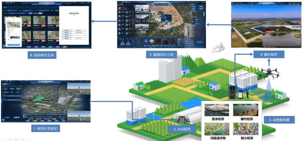 依托于低空AI算法能力,通过无人值守机场常态化巡检,可实时识别灌区管理异常事件,联动预警消息上报处置并智能生成巡查报告。同时,通过标准通讯协议接入手持/地面监控设备、墒情传感器等物联传感设备,形成“人巡+技巡”的“空地联动”智能巡查体系。