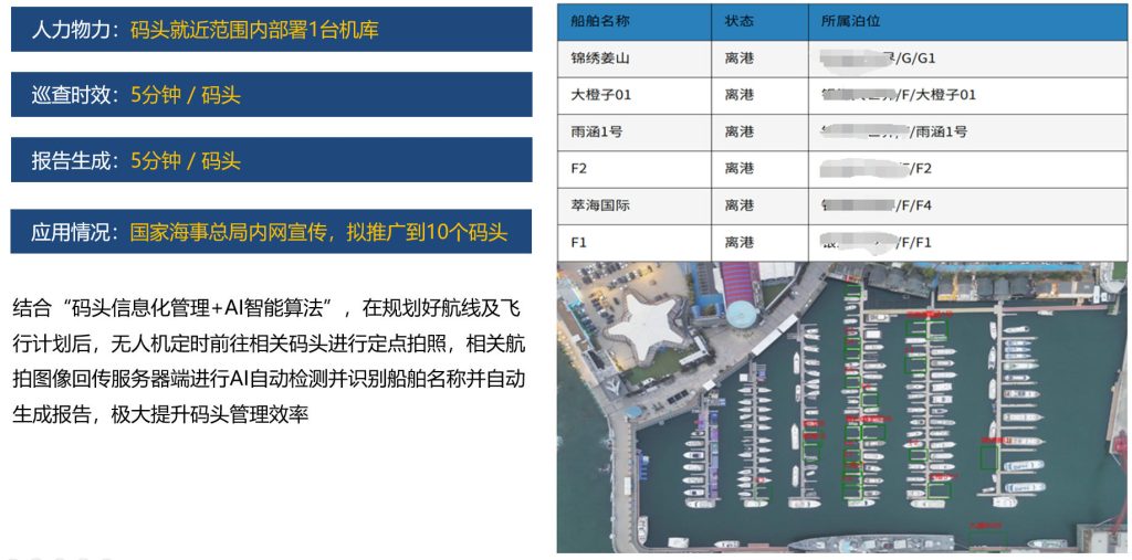 某海事局在码头点验管理上实现了重大革新。以往传统方式耗费大量人力物力且效率低下,而如今在码头就近范围部署1台机库,巡查时效从原来的0.5天缩短至5分钟,报告生成也从1天提速到5分钟。其革新之处在于结合“码头信息化管理+AI智能算法”,无人机按规划航线定时拍照,图像回传服务器进行AI自动检测、识别船舶名称并生成报告。这一成果已获国家海事总局内网宣传,还拟推广到10个码头,能极大提升码头管理整体效率。